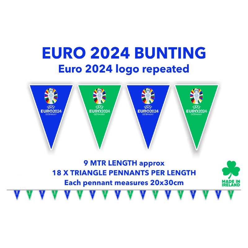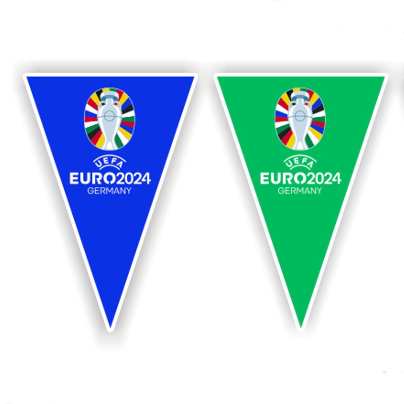 Contact Us To OrderOur Euro 2024 logo triangle pennant bunting comes in alternating blue and green colours and is made using our knitted polyester flag material so it is fully suitable for both indoor and outdoor (noise free) use.