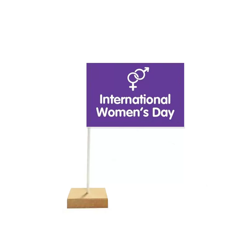 1 x International Womens Day table-flag 8cm x 15cm mounted on plastic pole with Wooden Base, perfect for your office desk on International Womens Day