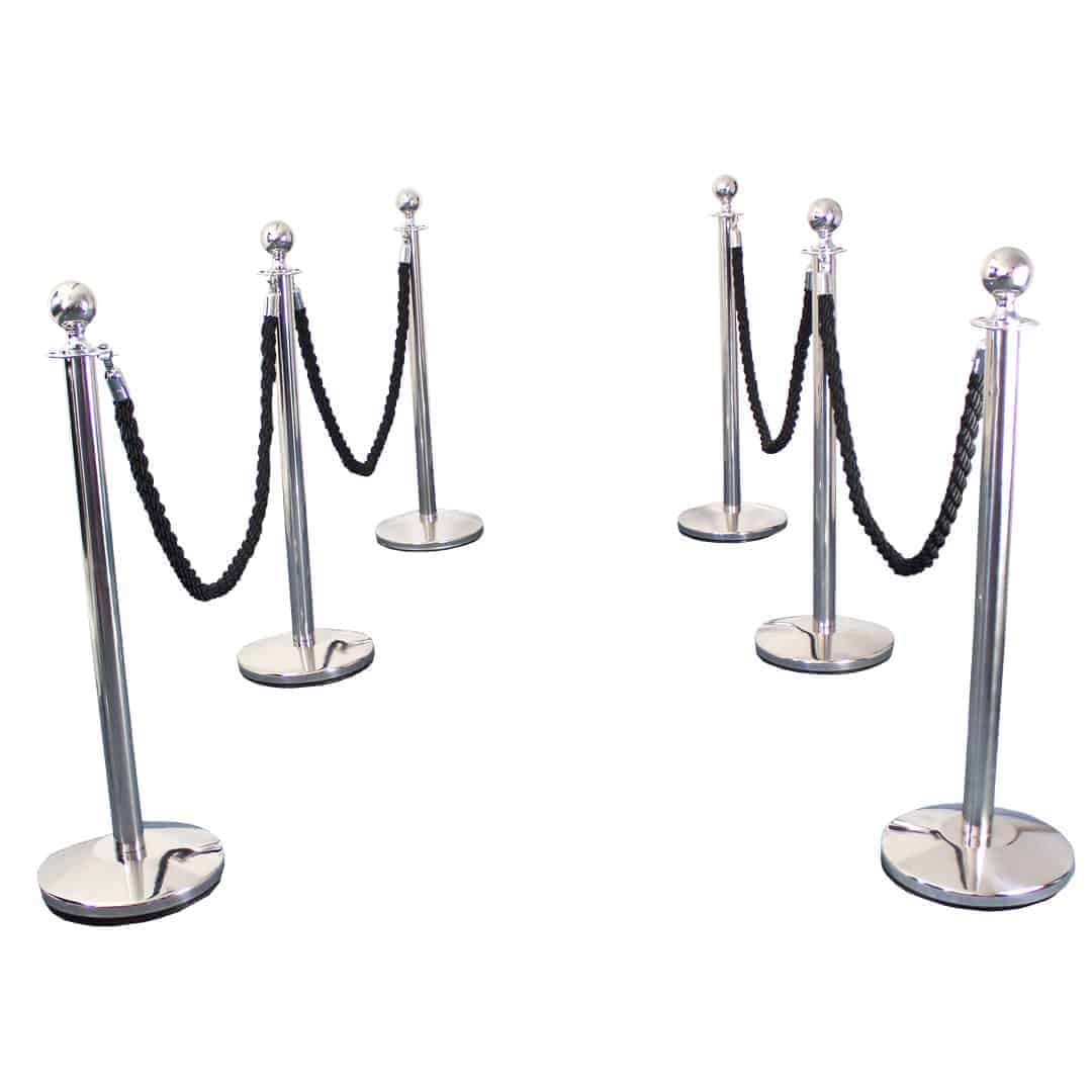 Simply clip the luxury quality soft braided rope to the four-way cast loop on the pole for a low cost solution for temporary pedestrian walkways, cordened areas, vip entrances, barriers and more.