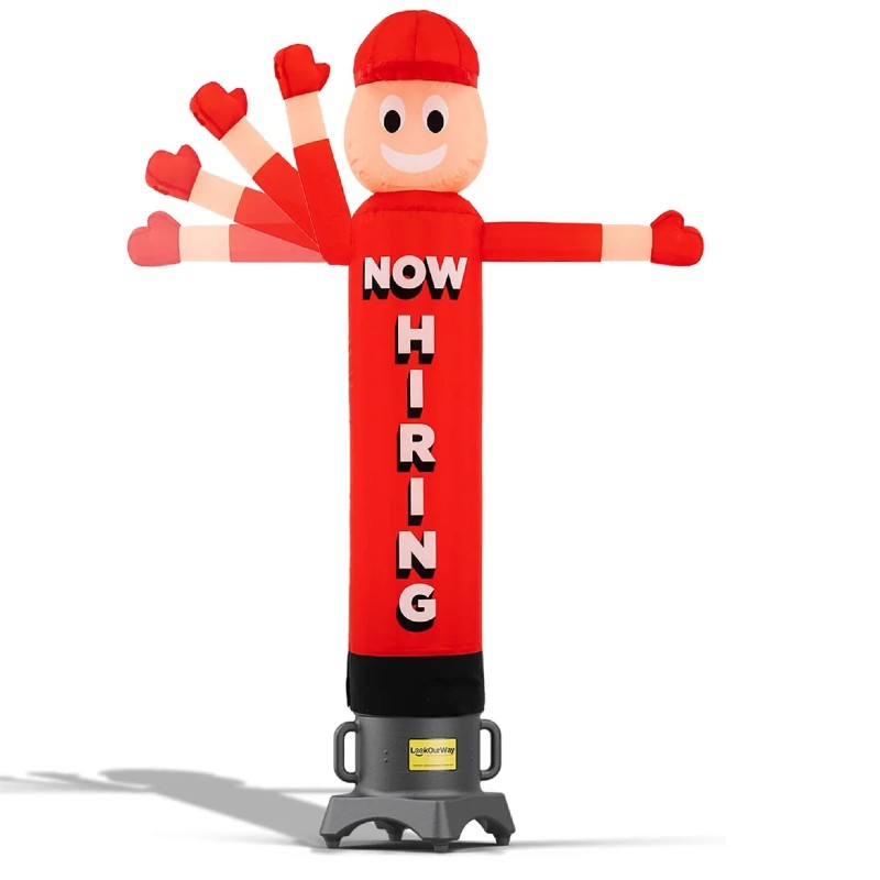 Contact Us To OrderWhen it’s time to hire new help, there’s no better way to do it than with our inflatable tube man advertising Air Wavers®. This 6ft tall tube man is perfect for creating a high-energy atmosphere and generating excitement about your business. This larger-than-life advertising tool is perfect for big and small businesses alike, as it can be used indoors or outdoors to attract potential employees. Simply plug in the air blower and watch this inflatable tube man come to life!
